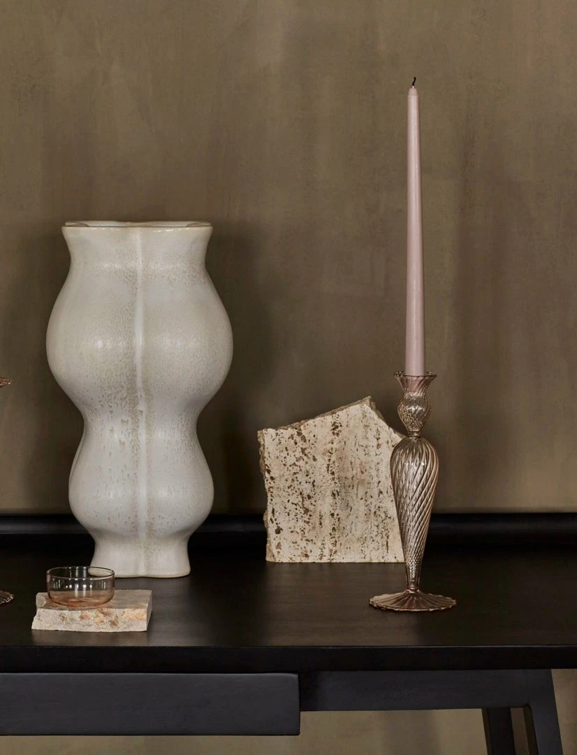 A small and delicate glass candle holder in a beautiful hue of pale pink. The design of the glass in a mermaids tail shape ensures that this holder will stand out from all the rest. It would look wonderful with any of our tapered ester & Erik dining candles which come in over 60 shades. Bring a touch of sophistication to your dining table with these truly remarkable candle holders. This is a brand new range created by fashion brand Day Birger Et Mikkleson. We love!