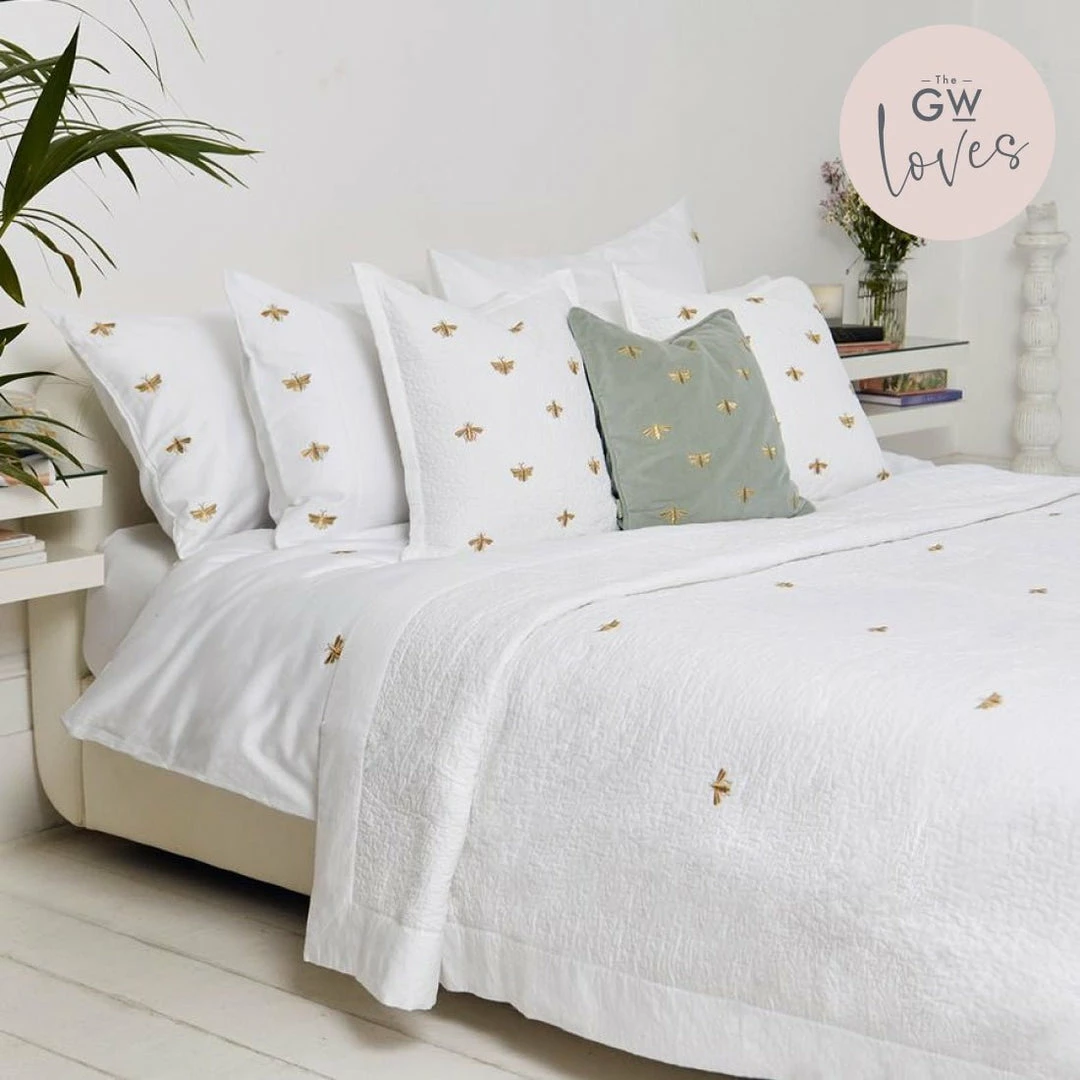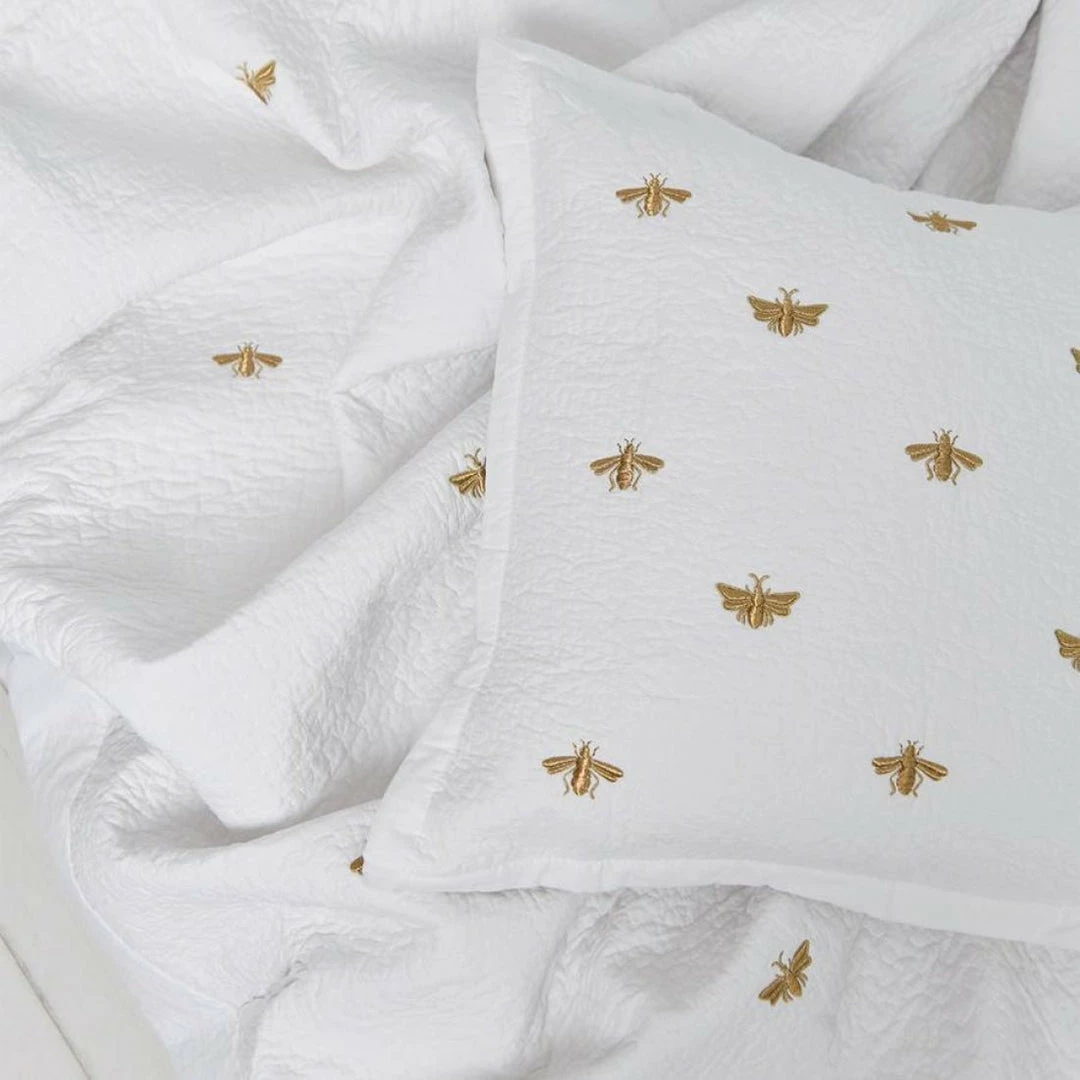 This luxuriously soft 100% cotton sateen quilt has been made to hotel quality standard. The bees motif has been delicately embroidered onto a smooth 180 thread-count base with a crisp white border to finish. Layer with our embroidered cushions and soft bed sheets for the ultimate night’s sleep.ย