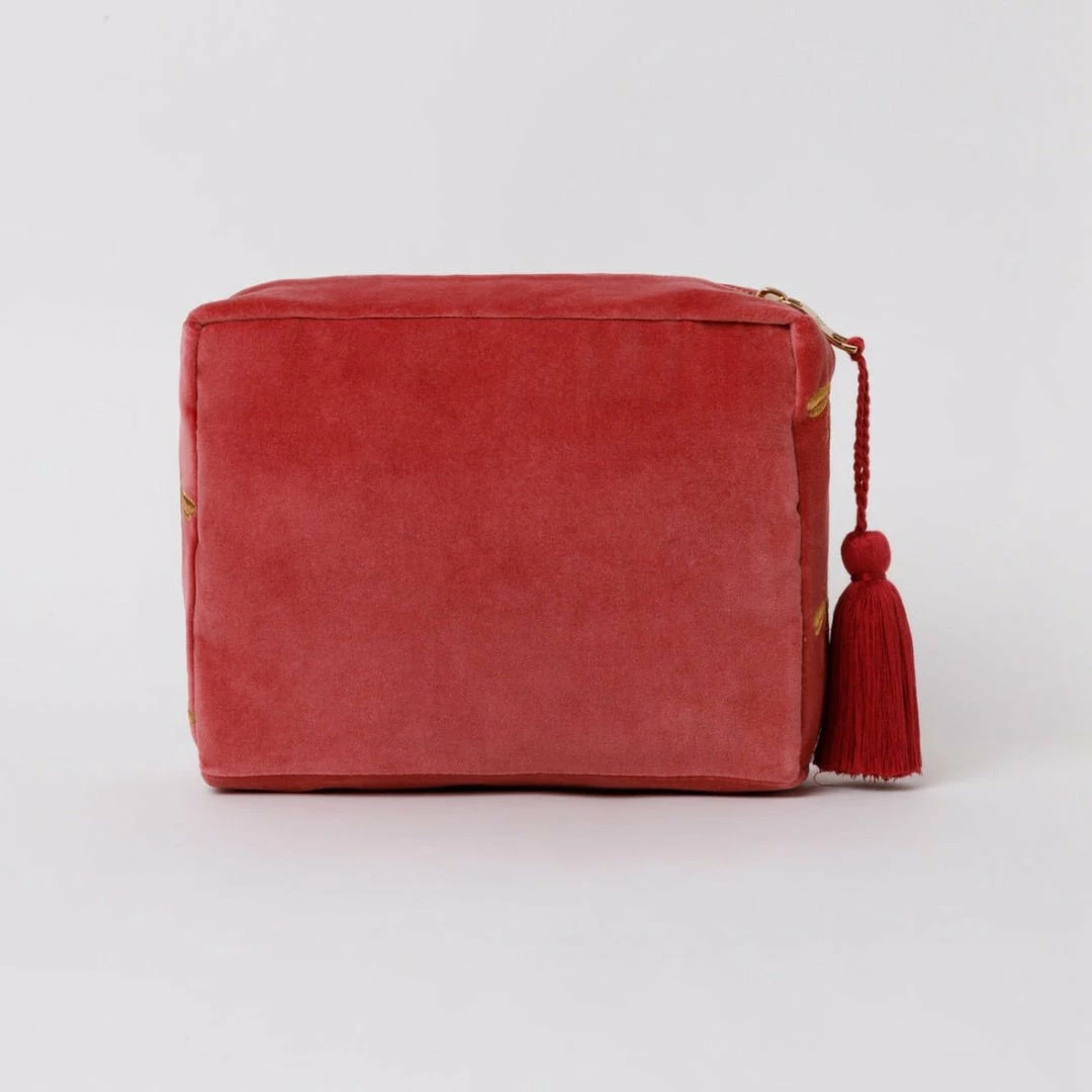 Inspired by the enchanting nature of the honey bee, Elizabeth took to her sketchbook and illustrated the humble creatures, capturing their extraordinary detail in pencil and watercolours. The final wash bag design features embroidered bees shimmering with gold thread on soft, dusky pink velvet.