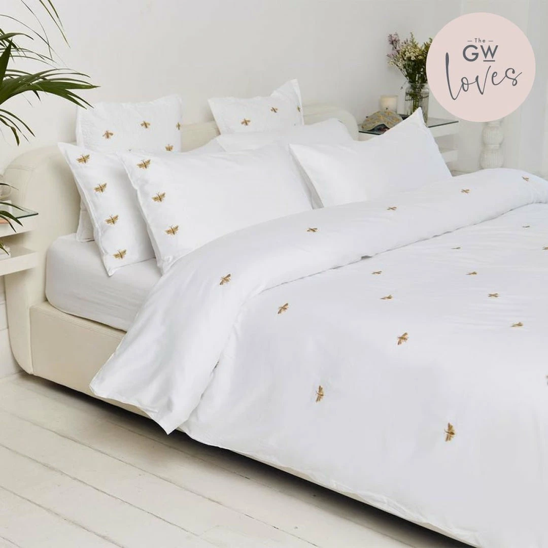 This luxuriously soft 100% cotton sateen bed linen is made to hotel quality standard. The Elizabeth Scarlett golden bumblebee motif has been delicately embroidered onto a smooth 300 thread-count base. The set includes a duvet cover with two standard pillowcases.