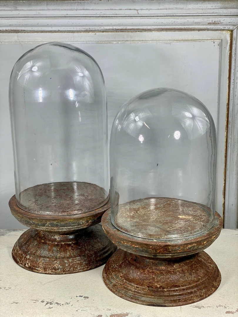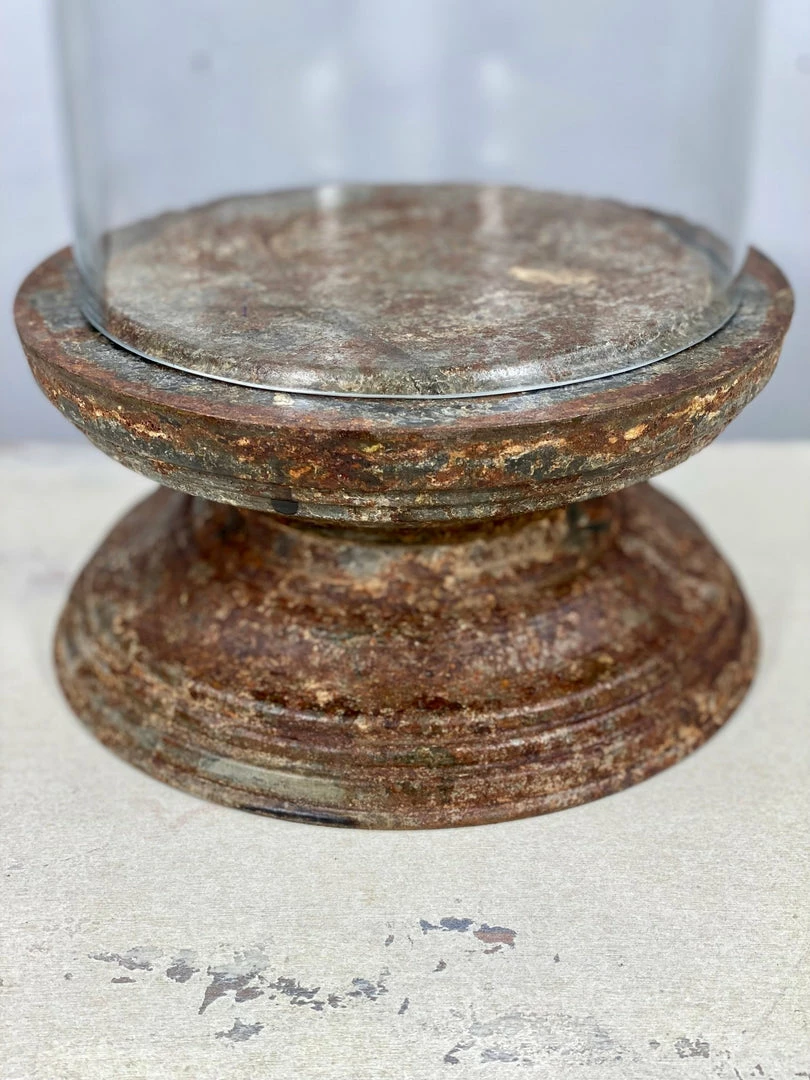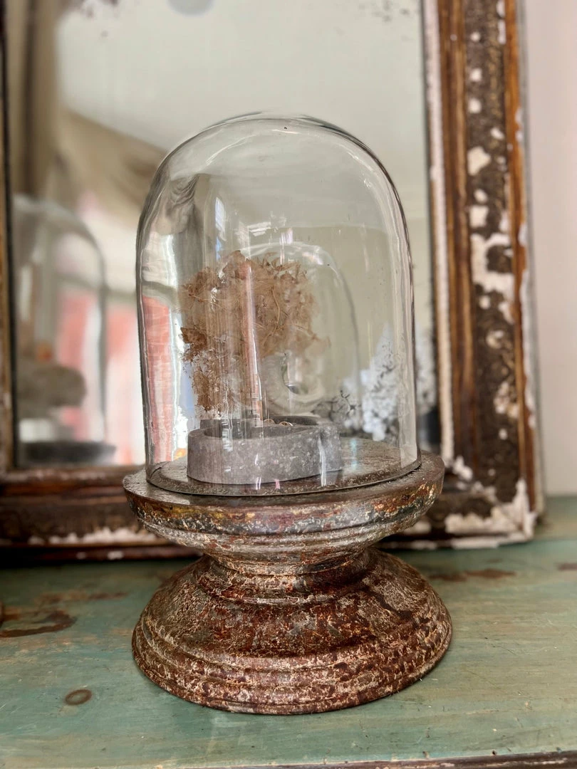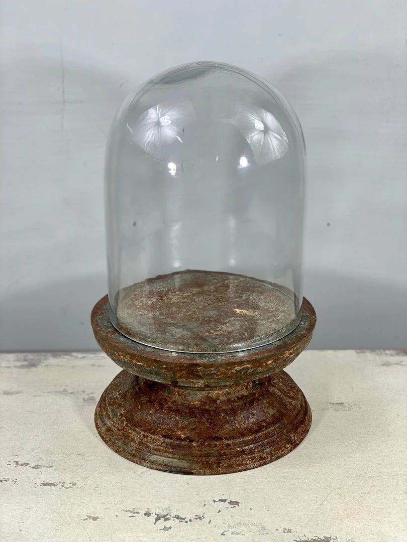 A beautiful decorative glass dome with an antiqued zinc base. Fill with beautiful objects and pair with the larger size for dramatic effect and create a stunning display. Exclusive to The Grey Works each piece is unique and as such the base will vary slightly in pattern.