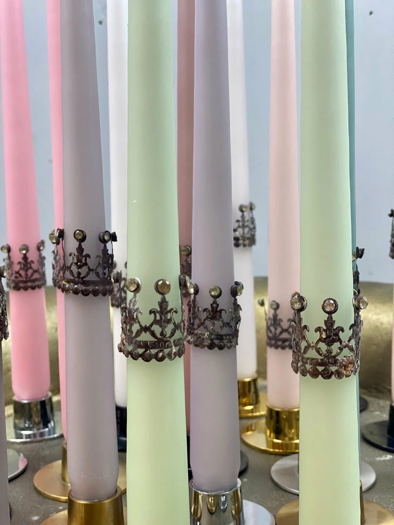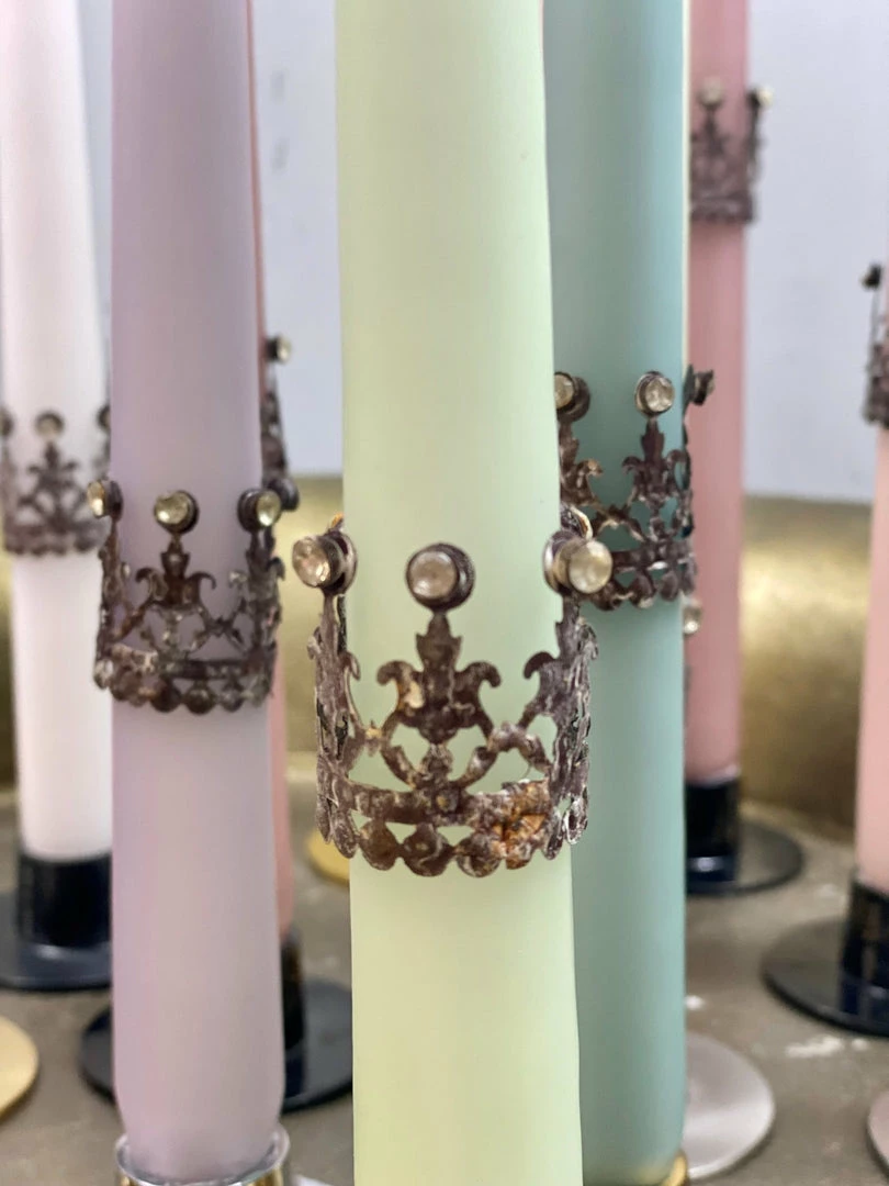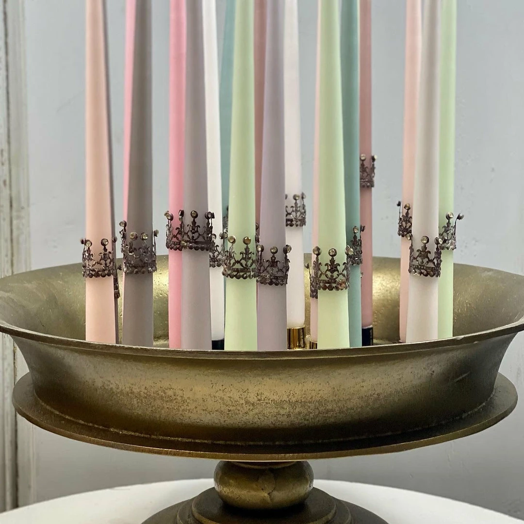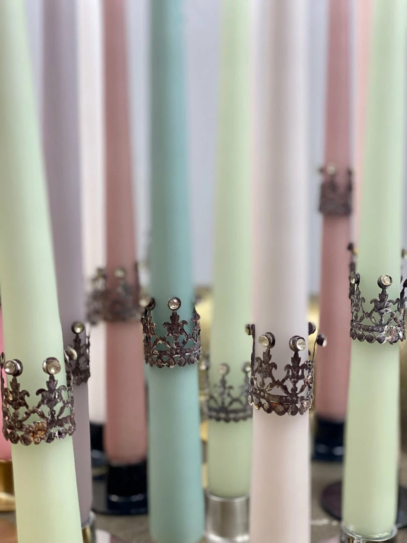 These stunning filigree mini candle crowns in delicate antiquedΒ brass will bring a touch of decadence to your tapered candles. Each oneΒ has been delicately embellished and handmade with love. They pair beautifully with our tapered dining candles by ester & erik Β available in over 70 stunning shades. Β