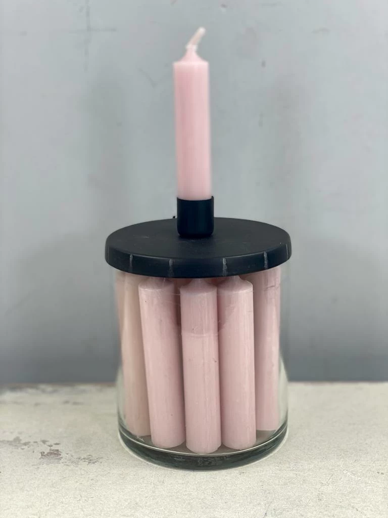 This beautiful candle holder is filled with 12 pinkΒ dinner candles. It looks beautiful on display and would also make the perfect gift for a host or loved one!