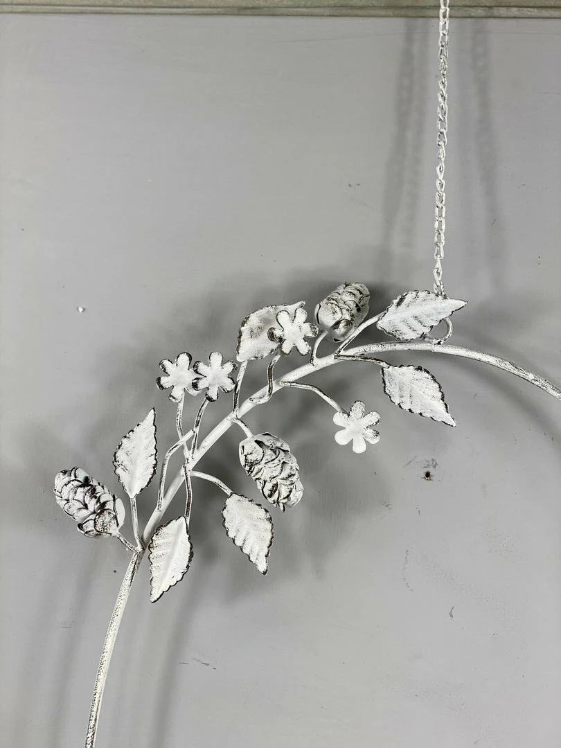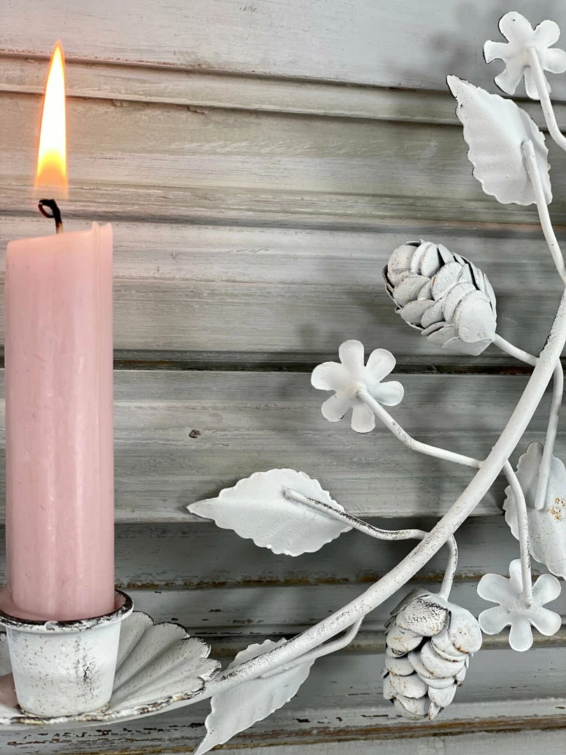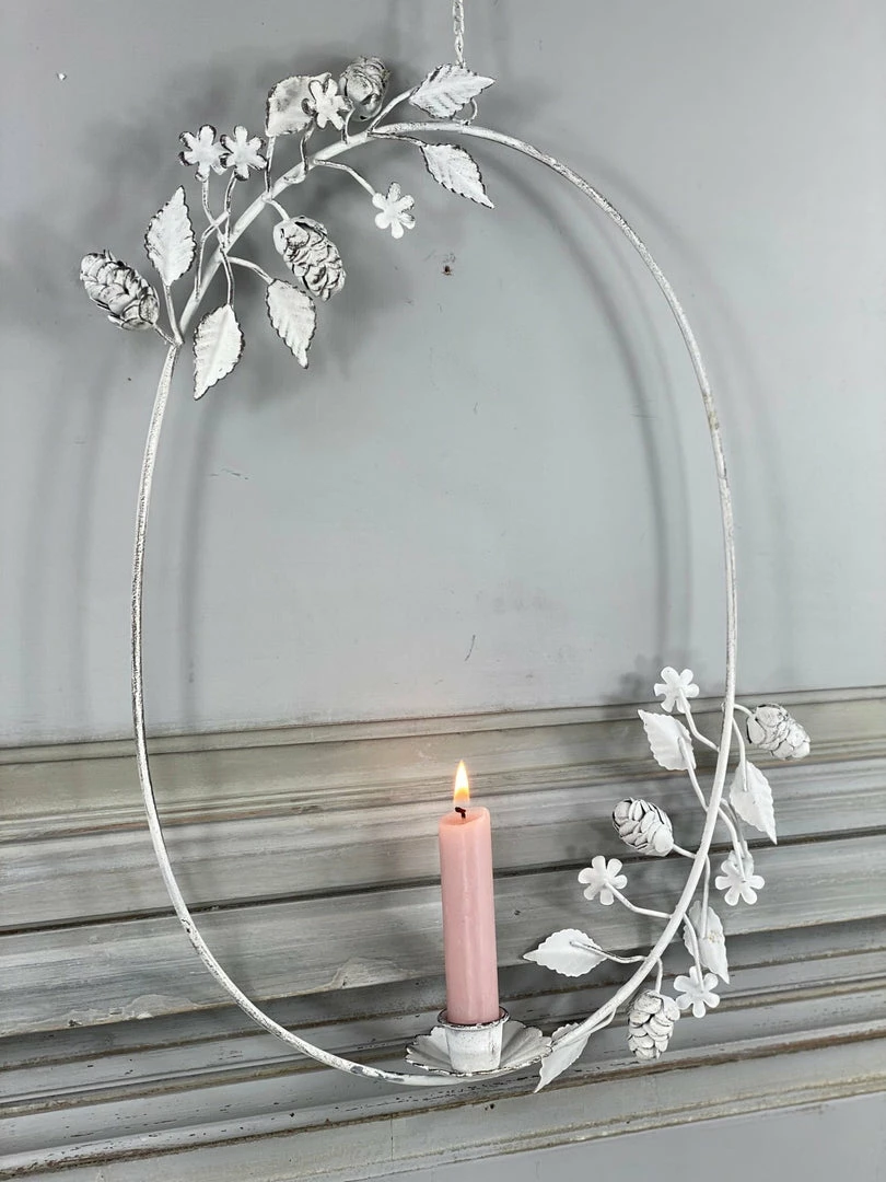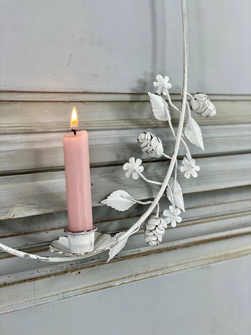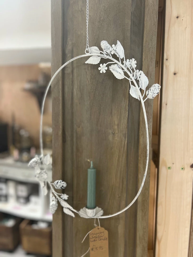 A petite white metal wreath with leaf adornment that fits our mini dinner candles perfectly. An unusual and really pretty display piece that hangs from a chain with a hook and looks beautiful when displayed in a collection. Please choose your candle colour when you order and pop a note in the message box.