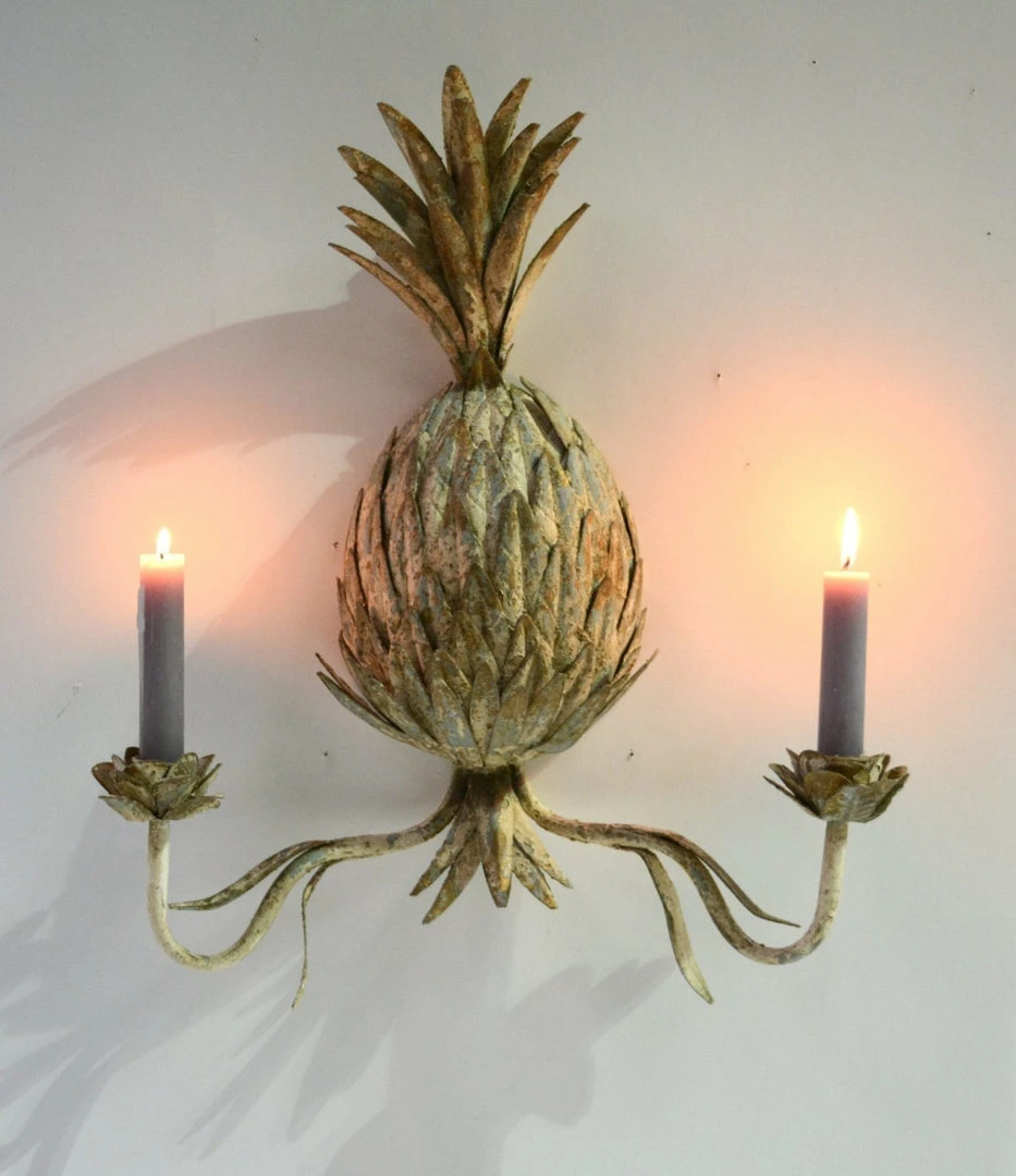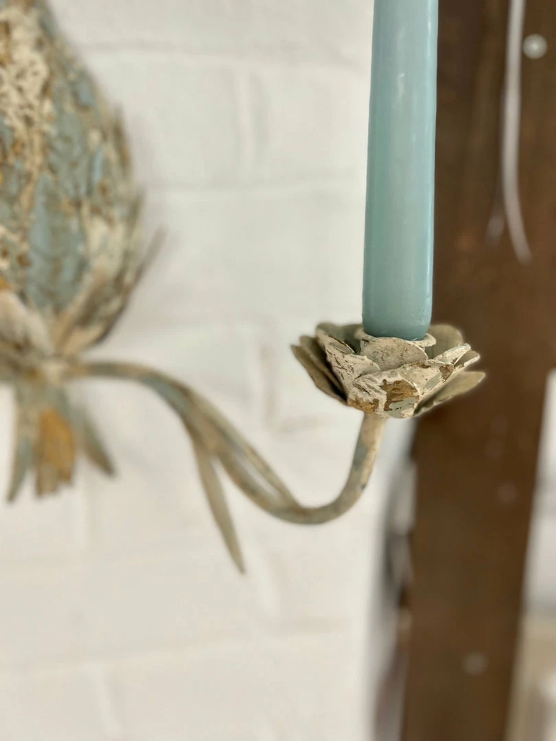 This stylish Pia wall sconce candle holder with a beautiful patina will look stunning in any room of your home. It is both quirky and timeless. This charming wall sconce will add character, creating a fantastic focal point. Whether you choose to hang as a pair to frame a mirror or fireplace, or to hang alone, this beautifully weathered piece make a stylish impression.