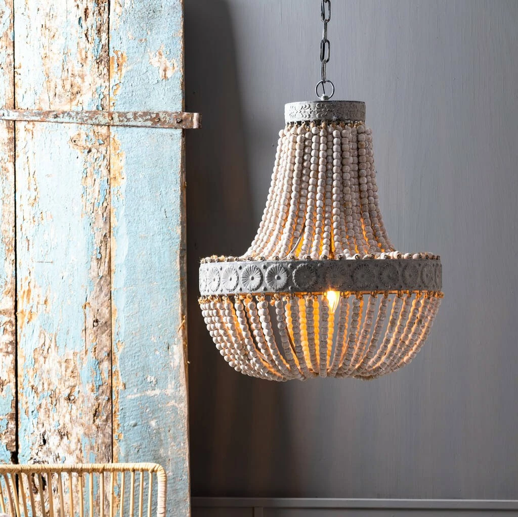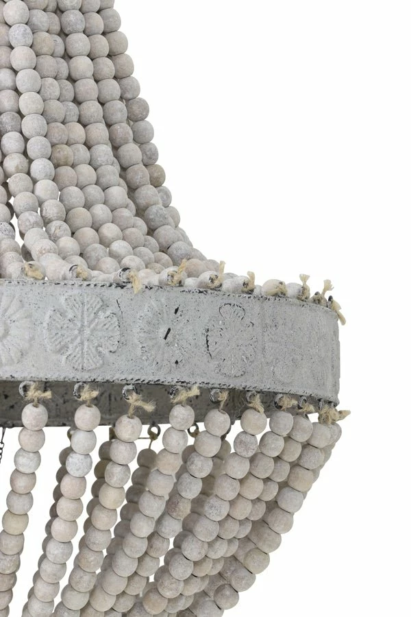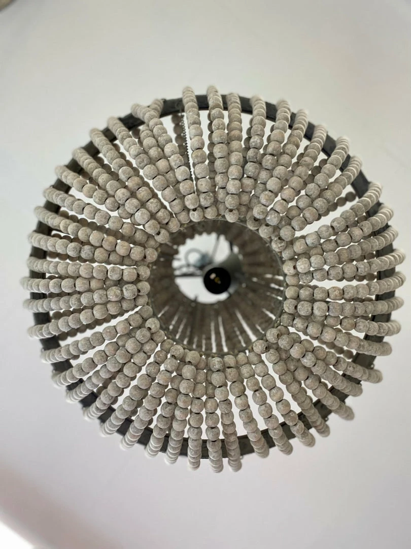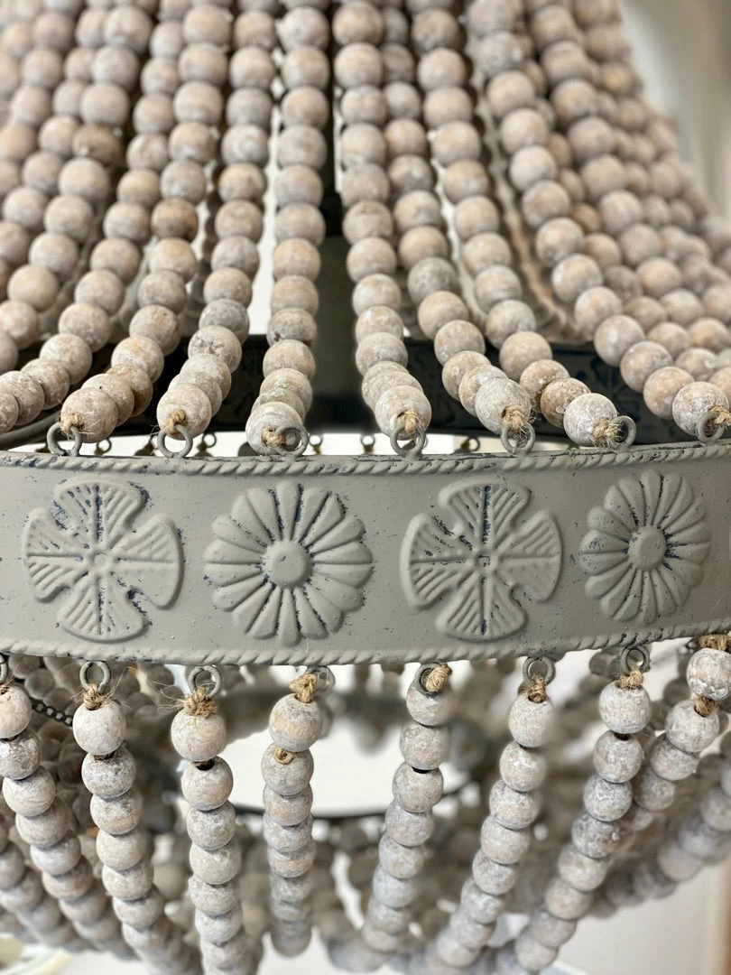 A simple yet gorgeous chandelier made of antiqued old white wood beads that catch the light so beautifully with an antiqued French grey metal work. Not too heavy in weight but enough substance to add accent and drama to any focal point.