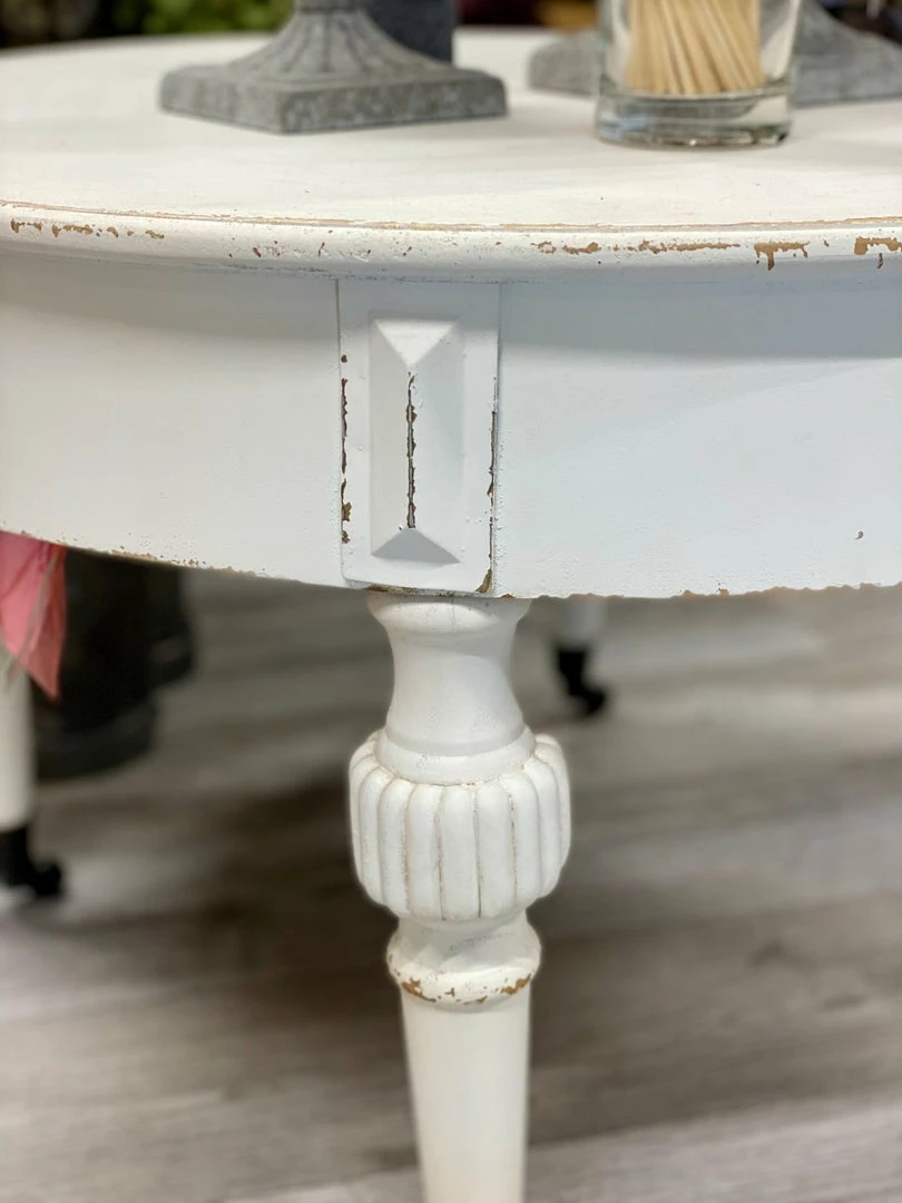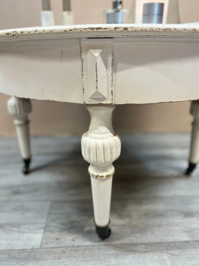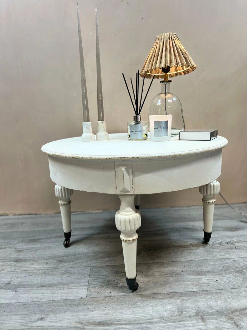 In the French style this table is rendered in fir wood and iron with an off white painted and slightly distressed finish, this neat design can be wheeled to your location of choice, making it pretty perfect for when guests come to visit, or to create a quiet corner. The legs screw into this piece.ย
