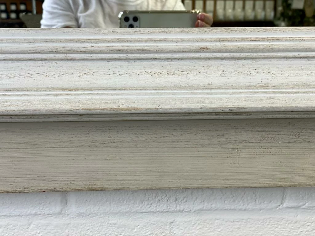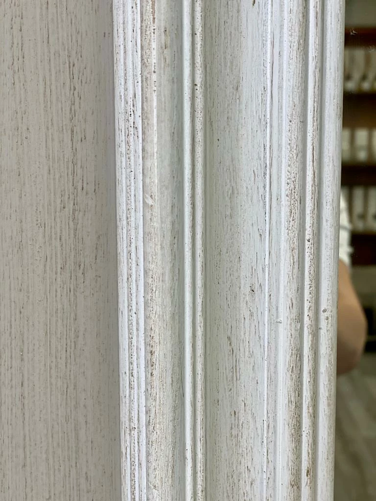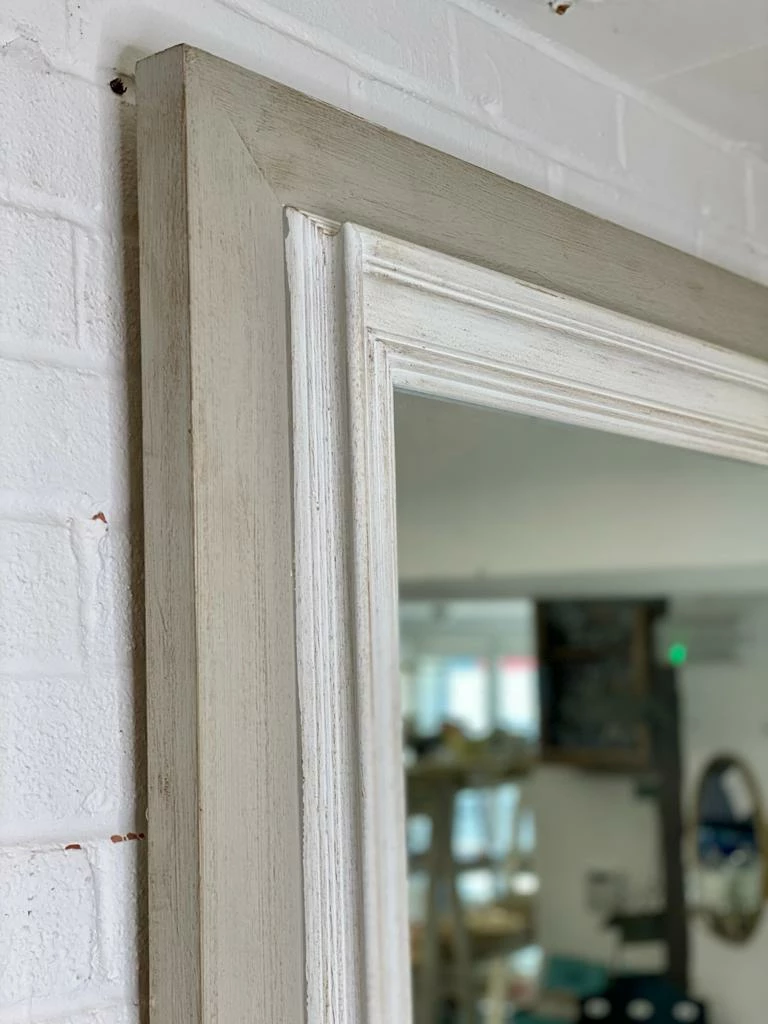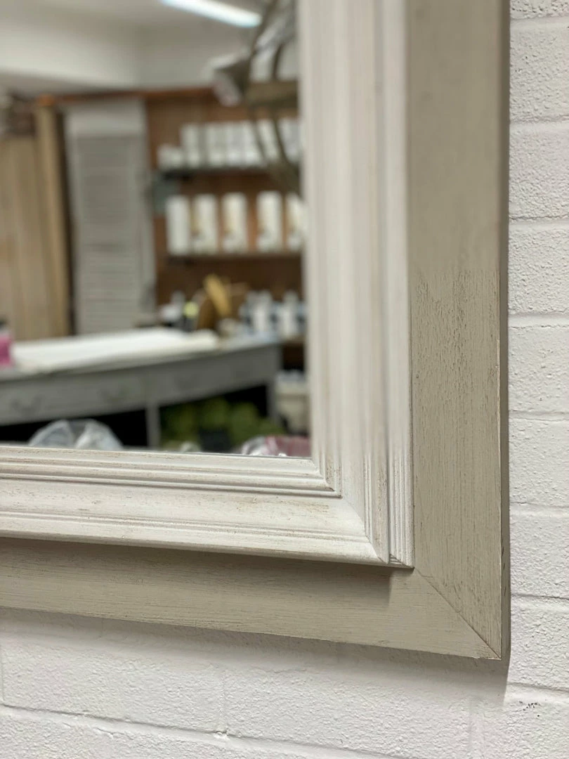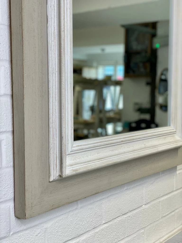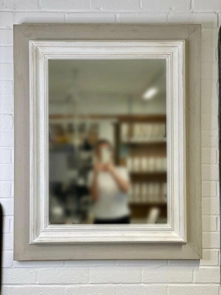 A beautifulΒ solid wooden mirror with a picture frame edge that would lend itself to any interior colourscape or scheme. It is painted in a soft grey with a white centre frame. It can be hung portrait or landscape.