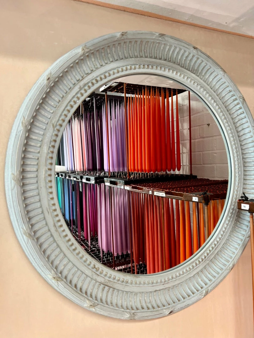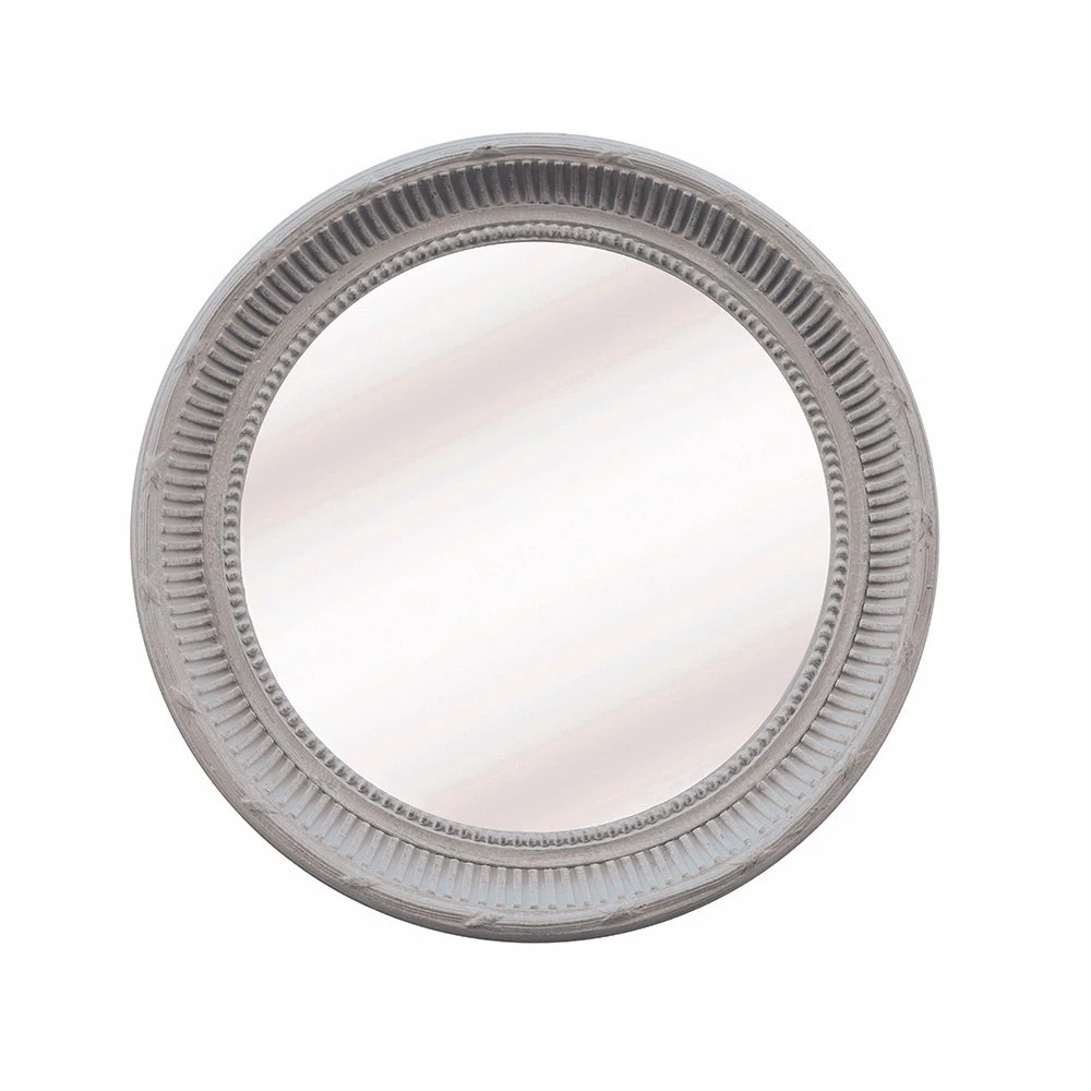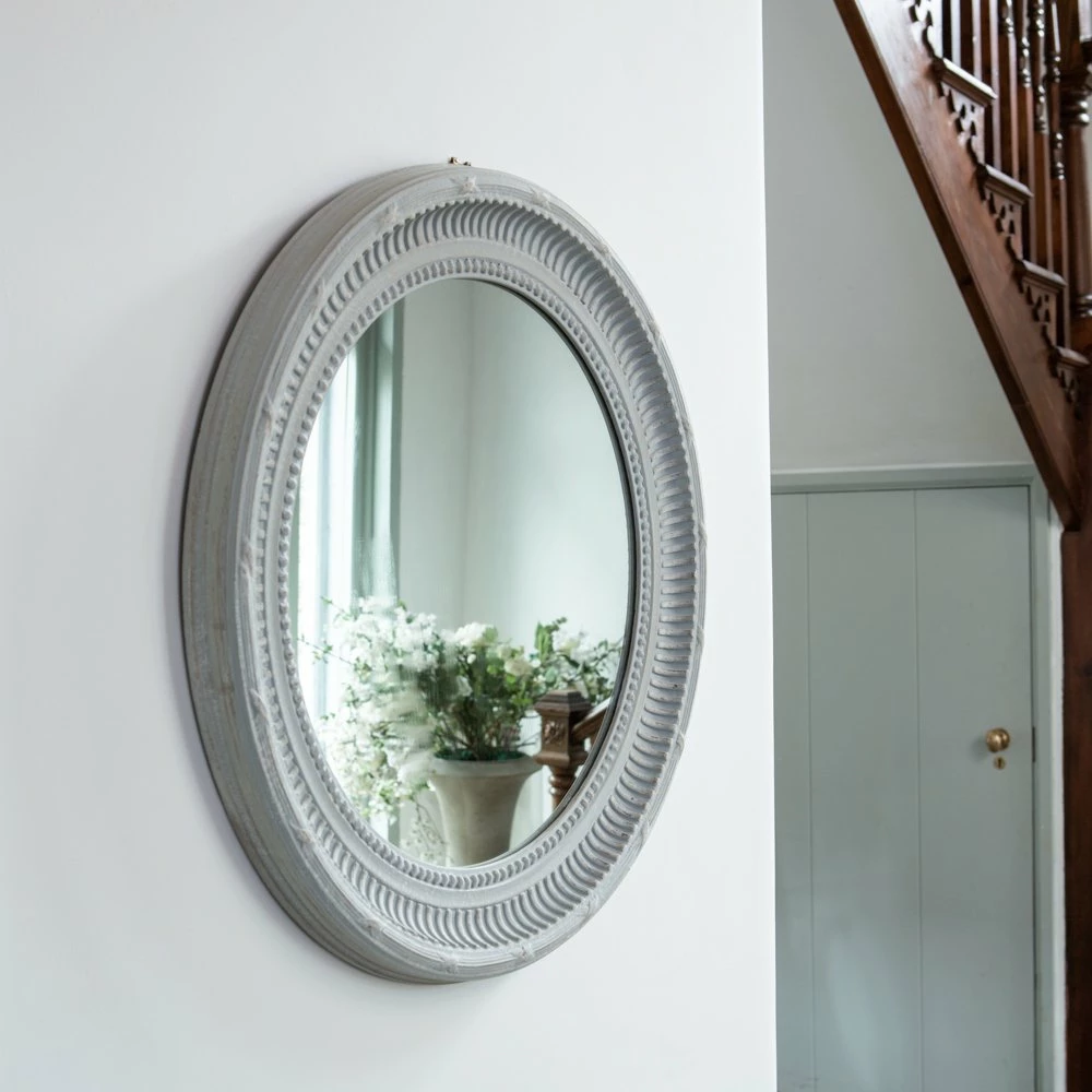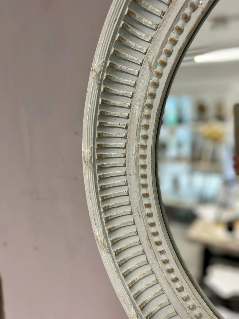 A rather pleasing round wooden mirror with line and bead carving.Β Predominantly pale grey with some darker antiquedΒ detailing to add a little interest.Β This would work perfectly in the hallway or over a basin. Where would you put yours?