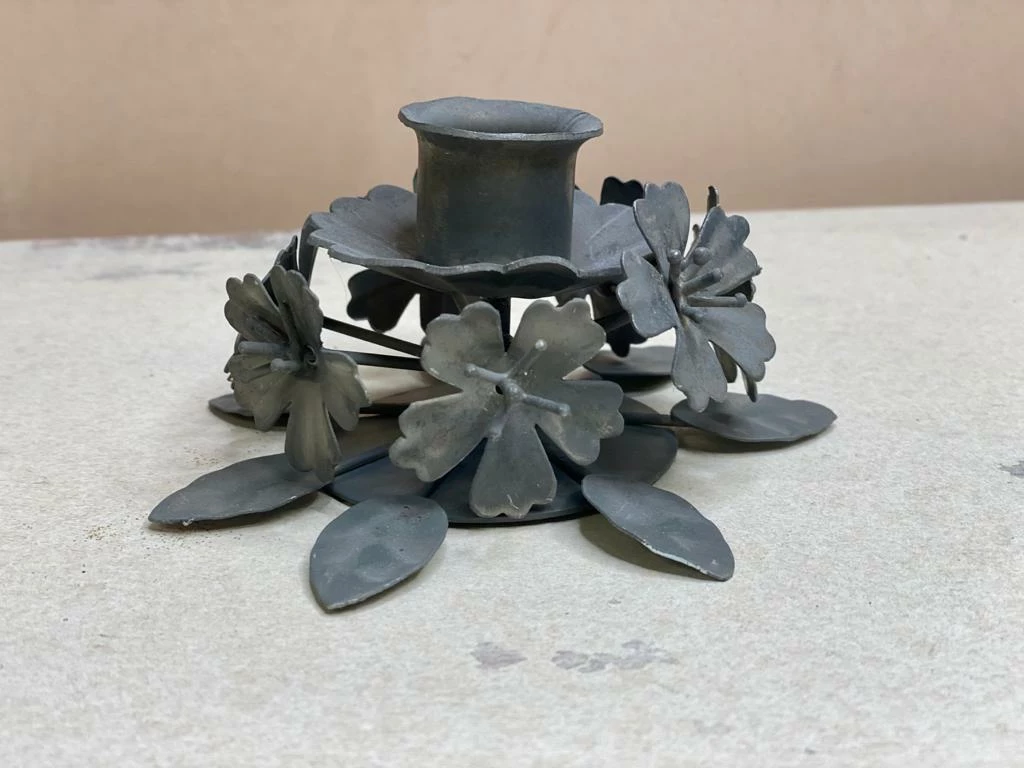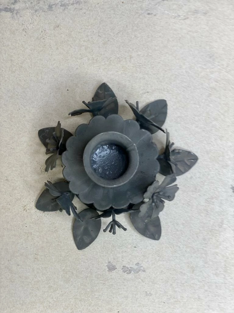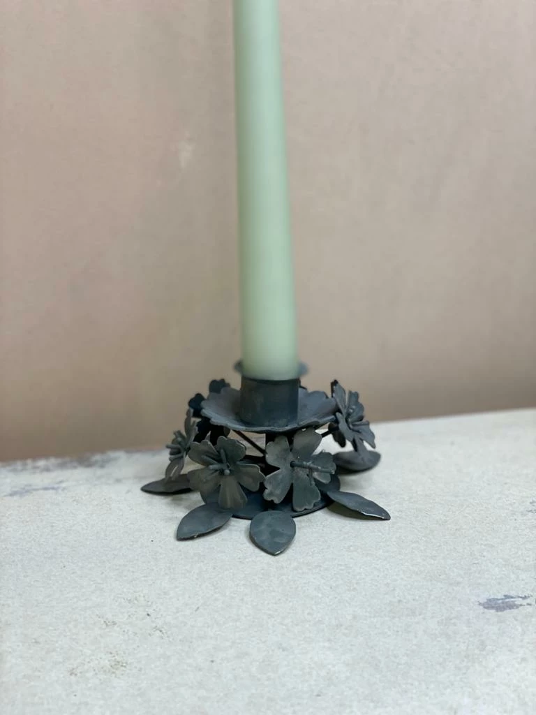 A pretty little candle holder in grey zinc with a floral adornment which fits any of out taper candles or dinner candles perfectly. Pair with a another or group together for added interest.Β